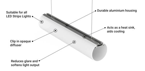 Suspended Round Aluminum LED Profile 30mm 60mm 120mm Diameter With PC Diffused Cover Led Strip Light